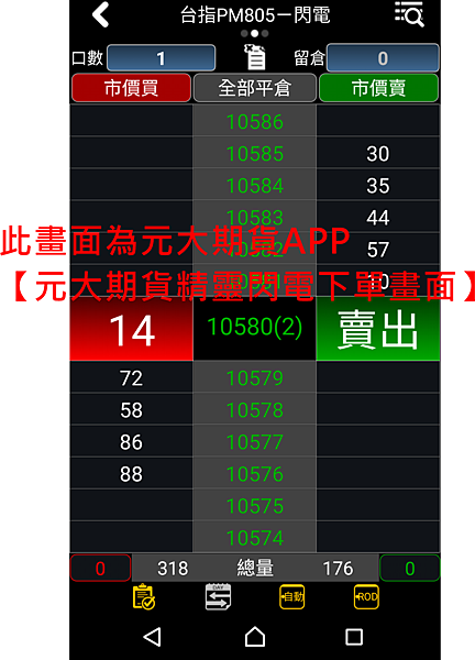 3. 長按報價:可以帶入此商品的下單畫面,你問我元大軟體手機版有沒有【閃電下單】的畫面?有!當然有,可是是在另一個下單軟體【元大期貨精靈裡面才有】,所以說...下載元大期貨精靈一方面可以使用好用的閃電下單軟體,一方面又可以當備援系統!非常好!